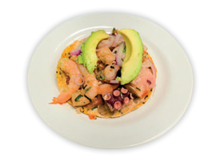 Tostada de Mariscos (pescado, pulpo y camarón)